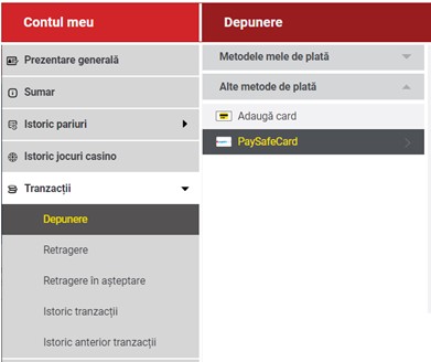 Pentru a depune prin intermediul Paysafecard, va trebui să accesezi rubrica ”Depunere” din ”Contul meu” și să selectezi metoda de plată Paysafecard.