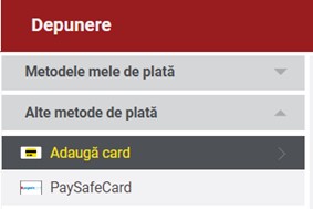 Pentru a depune prin intermediul unui card bancar, este necesar să accesezi rubrica ”Depunere” din ”Contul meu” și să selectezi opțiunea ”Adaugă card”.