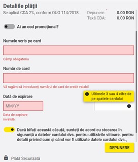 Reține că va trebui să fii de acord cu stocarea în siguranță a datelor cardului pe care îl înregistrezi, după ce accesezi și citești toate detaliile. După înregistrarea cu succes a cardului, vei putea să-l utilizezi în viitor fără a mai parcurge procesul de adăugare a cardului. Cardul va rămâne înregistrat în cont și prin simpla accesare a acestuia vei putea să inițiezi o nouă tranzacție de alimentare a contului de joc.