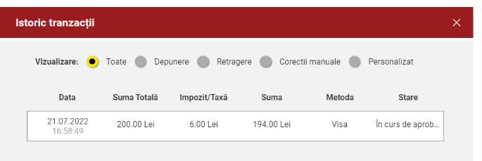- dacă cererea ta de retragere a fost deja procesată, ai posibilitatea de a accesa Contul meu - Tranzacții - Istoric Tranzacții. Printr-un click pe tranzacția de retragere procesată ți se vor afișa toate informațiile relevante ale retragerii tale.