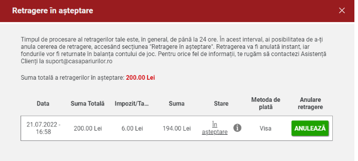 - dacă ai o cerere de retragere în așteptare, poți accesa Contul meu - Tranzacții - Retragere în așteptare. În această secțiune vei regăsi detaliile privind suma ce a fost reținută pentru impozit, suma pe care o vei primi precum și suma totală retrasă din contul tău de joc