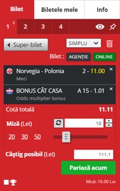 În funcție de tip de pariu pe care dorești să-l plasezi (pre-meci sau live), mergi pe secțiunea aferentă. Odată indetificat evenimentul pe care dorești să parizei, pur și simplu alege din oferta acestuia tipul de pariu dorit și dă click sau tap pe cota afișată. Vei observa că pe biletul de pariuri va apărea selecția aleasă de tine. După pregătirea biletului, introdu miza dorită și plasează pariul. Odată plasat cu succes, pe ecranul dispozitivului tău va apărea o notificare în acest sens.