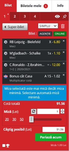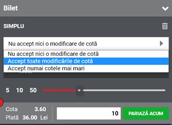 Există posibilitatea ca biletul tău de pariuri să nu poată fi plasat dacă evenimente de pe bilet au fost scoase între timp din oferta de pariere sau cotele s-au modificat, iar tu nu ai selectat opțiunea prin care accepți orice modificare de cotă.