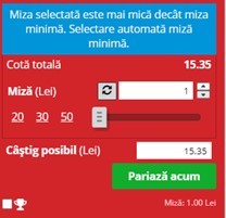 Miza minimă acceptată pentru biletele de pariuri live sau pre-meci este de 1 leu. În cazul în care miza pe care o setezi este mai mică de 1 leu, va fi automat corectată.