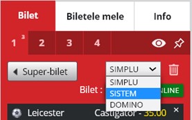 Indiferent de secțiunea aleasă, vei putea să plasezi pariuri Simple, Sistem sau Domino. Tipul de pariu dorit de tine, va trebui selectat de pe bilet. Orice bilet creat va fi considerat ca fiind Pariu Simplu. Dacă vei dori să schimbi tipul de pariu, va trebui să dai ”click” sau ”tap” pe butonul ”SIMPLU” și să selectezi din lista ce va fi afișată, tipul de pariu dorit.