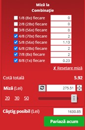 Pariul Sistem este biletul de pariuri cu minimum 2 selecții. La acest tip de pariu ai posibilitatea de a alege unul sau mai multe sisteme și să-ți stabilești selecții fixe. Fiecare sistem va genera un număr de combinații, iar miza ta va fi împărțită la toate combinațiile existente pe biletul de pariuri.