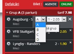 În dreptul fiecărui eveniment regăsit pe biletul tău de pariuri vei avea la dispoziție opțiunea de a-l muta în grupul dorit iar dreptul fiecărui grup ți se va afișa numărul total de evenimente din grupul respectiv precum și cota totală a acestuia.