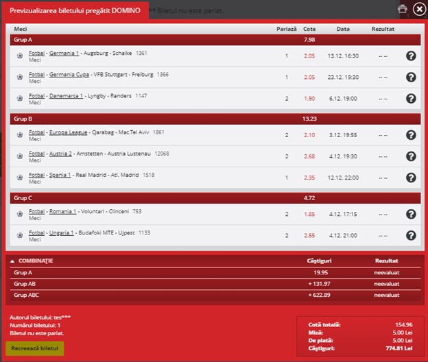 Casa Pariurilor îți oferă posibilitatea de a vizualiza toate combinațiile de câștig atribuite biletului tău DOMINO înainte de plasarea acestuia.