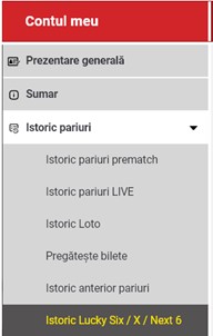 Poți să verifici biletele de pariuri virtuale, accesând ”Contul meu” – ”Istoric pariuri” – ” Istoric Lucky Six / X / Next 6”.