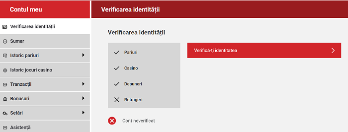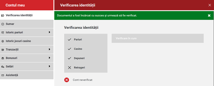 Pentru a parcurge procesul de verificare a contului de joc, accesează ”Contul meu” – ”Verificarea identității”, unde vei observa câmpul de încărcare a documentelor. Selectează din listă documentul al cărei poză o vei încărca și dă click pe butonul ”Încarcă”.
