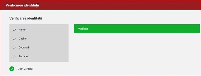 În momentul în care contul tău de joc este validat, vei primi din partea noastră o notificare prin e-mail în acest sens. De asemenea, vei observa că în contul tău de joc s-au activat metodele de retragere, iar limita la depunere a fost ridicată. La rubrica ”Verificarea identității”, status-ul contului tău se va modifica. La fel și permisiile.